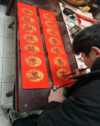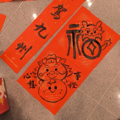 “龙飞凤舞迎新年,张灯结彩贴春联”特色春联篇。春联是我国传统文化的瑰宝,为人们所喜闻乐见,因其语言对仗工整、简洁精巧,是浓浓年味儿里不可或缺的一部分,更是中华民族非物质文化遗产的重要组成部分。春节来临之际,同学们纷纷手握毛笔,整齐的桌子一字排开,红红的春联纸竞相铺开,淡淡的墨香扑鼻而来,写春联、贴春联、写福字,满满祝福之意跃然纸上,纷纷表达出对甲辰龙年的美好祝愿和殷切期盼,化为节日里最亮丽的一道风景线。